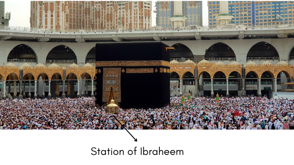 Maqam-e-Ibraheem has a blackish-red stone with a little bit of whiteness. It has the footprints of the Prophet Abraham. The stone is placed in a glass dome encased in a golden cage, which the pilgrims can see.