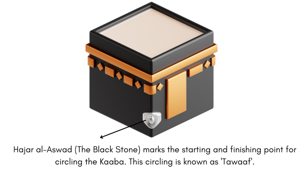 A black Stone called ‘Al-Hajar al-Aswad’ is located in the southeastern corner of the Kaaba. The Angel Jibreel brought it from Paradise and placed it in this corner.